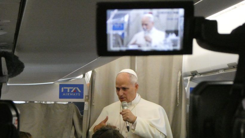 Papst Leo XIV. bei der Pressekonferenz auf dem Weg von Beirut nach Rom. (Foto: Erbacher)